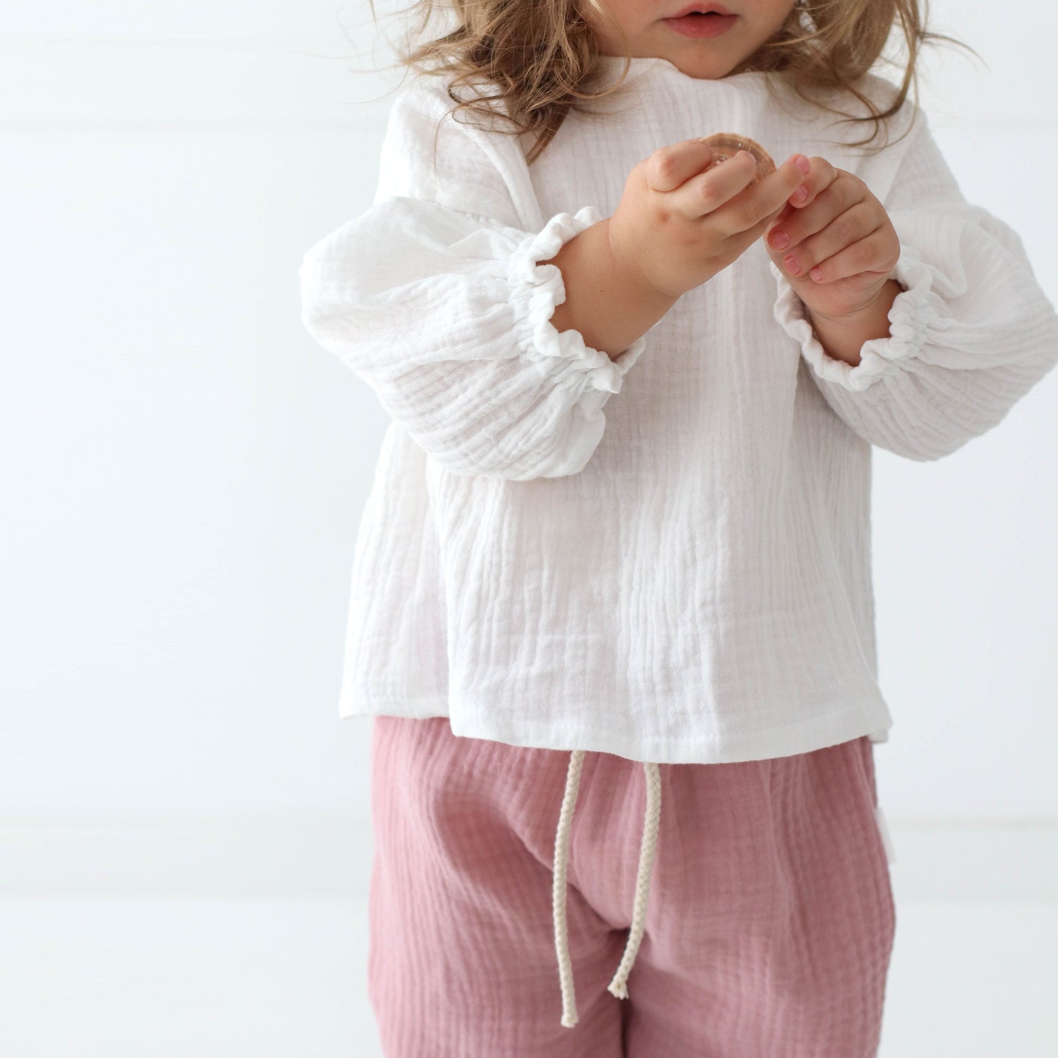A breezy little dream for your mini! This handmade muslin double gauze top features playful puffy sleeves, soft elastic cuffs for comfort, and sweet coconut buttons at the back. Made to order with love, it’s the perfect mix of cozy and chic for every little adventure.